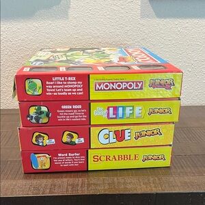 Exciting Hasbro Junior games for kids. Includes Monopoly, The Game of Life, Clue, and Scrabble. Bright colors for fun playtime.