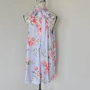 Chic lavender mini dress with vibrant floral pattern. Halter neck design. Ideal for weddings!