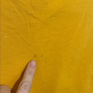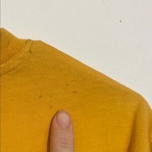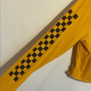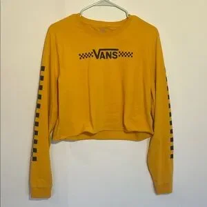 Mustard long sleeve crop top. Black checkered pattern on sleeves. Vans logo on front.