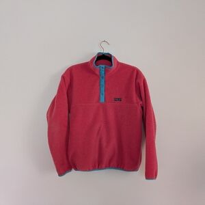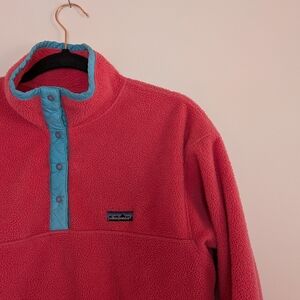 made in Canada Patagonia fleece! apparently they made some clothing here in the 80s/90s which is a new fun fact. good heavy fleece, minor signs of wear but way better quality than the ones made today. this is less pink than it shows up, it's a pale red/pinkish tones. photo of tag shows true colour best! fits like a women's medium.