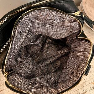 The perfect bag! Three compartments, so roomy! Braided handles and braided leather design on sides. Extra strap to convert to a crossbody. Leather is in excellent condition (see video for close up), no stains or rips on interior.