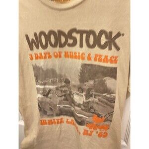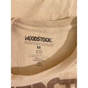 The Woodstock tee shirt in medium size features a graphic print of the iconic Woodstock logo, with a tan color and made of cotton material. This short sleeve shirt with a crew neck and regular fit is suitable for both men and women, and is machine washable. Perfect for music and 60s themed occasions, this Woodstock branded tee shirt is a must-have for any fan of the legendary music festival.
