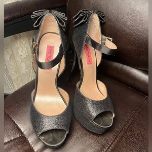 Betsey Johnson 5” Black Glitter High Heels with Satin Bows