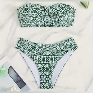 Green White Patterned Bandeau Bikini Set