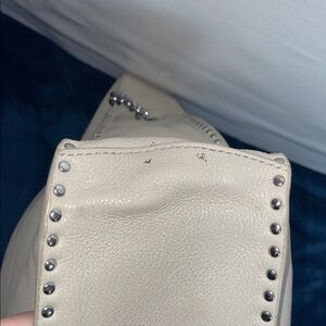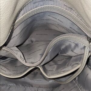 EUC cement pebbled leather Michael Kors ‘Astor’ large hobo. This hobo bag has 3 flaws. It is 1 small stain at the bottom of the interior lining. There are 2 small stain on the exterior bottom. No other flaws. No rips or odors. The leather shoulder strap is in excellent condition. The strap is not removable or adjustable. The second chain strap is removable, but not adjustable. It is also in excellent condition. The interior is in great condition. 13”L x 11”H. 12” shoulder drop.