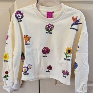 Chic cream sweatshirt with vibrant floral embellishments. Features colorful sequined flowers for a playful look. Perfect for casual outings.