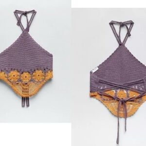 Elevate your bohemian wardrobe with Zara's latest addition - a purple orange crochet knit boho halter crop top that is both trendy and versatile.