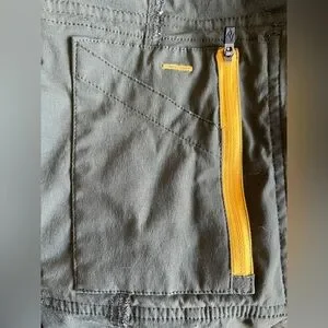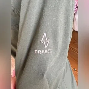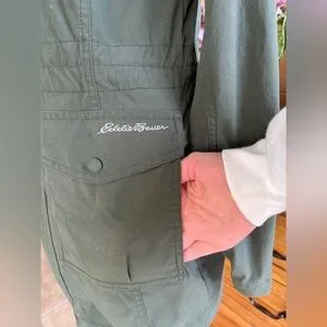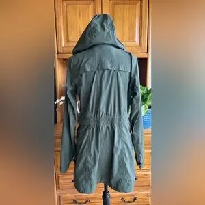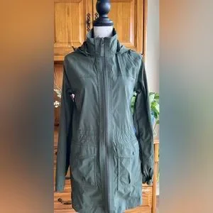 Army green lightweight jacket from Eddie Bauer. Has lots of packets, inside pocket has zippered packet with headphone hole. Two-way zipper at from and removable hood. Great condition- no stains or flaws, zipper works perfectly. Material is slightly stretchy which makes it very comfortable to wear. Perfect for rainy days, camping, hiking and travel.