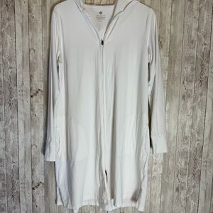 Solbari UPF50+ size medium white hooded jacket. Fabric is 51% viscose from bamboo, 40% cotton, and 9% elastane. Jacket has pockets and thumbholes.