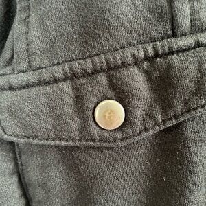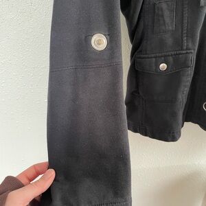 Chic black utility jacket by Vanity. Features a hood and multiple pockets. Ideal for layering. Lightweight. Some wear on the silver button snaps (see picture) otherwise in great condition. There are snaps on the arms to keep the sleeves up if you wish. Bundle and save! Any offers are welcome!