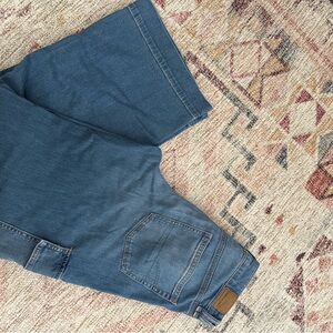 Classic blue denim cargo pants. Features multiple pockets and durable stitching.