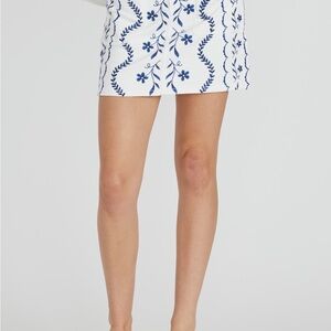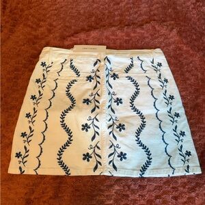 Charming mini skirt with delicate navy floral vine embroidery. Features vertical pattern stripes with dainty flowers and leaf motifs. Stylish summer design with scalloped embroidery details.