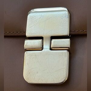 There is light scuffing on the clasp and a few small scratches on the front of the bag, only one of which is visible in the photos. The others are very subtle.