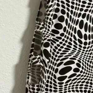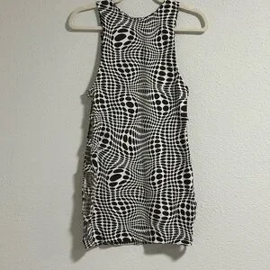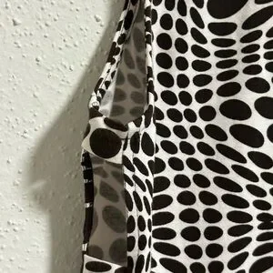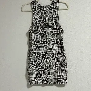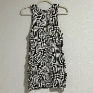 The NWT Motel mini dress in brown and white polka dots is a stylish and trendy addition to any woman's wardrobe. This sleeveless dress features a mock neck neckline and side cutouts, adding a touch of sophistication to its short length. Made from a comfortable cotton blend with a hint of Angora, this dress is perfect for a casual yet chic look.