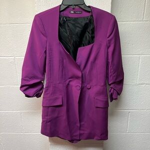 Chic purple blazer with a modern cut. Features button detail and structured shoulders. Ideal for elevating any outfit. Small hole on seam- see picture