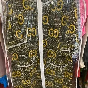 Stylish iconic Gucci maxi dress. Features bold black and yellow pattern. Iconic logo design. Perfect for any occasion.