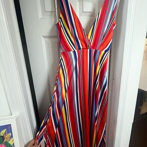 Bold and colorful backless maxi dress. Features a striking striped pattern. Perfect for making a statement.