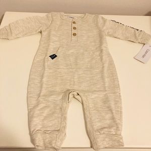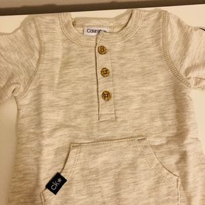 New with tags, cute logo coverall from Calvin Klein in ivory heather oatmeal color. Made with softly combed cotton for play-all-day comfort. Henley neckline, 3-button closure, mini patch pocket. Ankle-to-ankle snap open, ribbed cuffs, long sleeves. Machine Washable Cotton and Polyester blend.