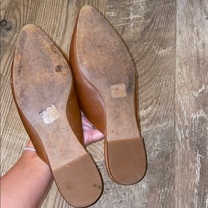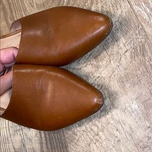 Sleek brown leather mules. Pointed toe design. Comfortable slip-on style.