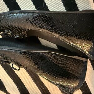 Sleek and stylish black wedge loafers with a glossy finish. Features a chic tassel detail. Size 7.5 but runs small, closer to a 7. Like new condition. See photos.