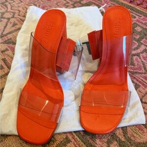 Make a statement with these stunning Schutz Victorie high block heel mule sandals in a bold orange colorway. Featuring sleek clear vinyl straps and a modern block heel, these mules are both fashion-forward and surprisingly versatile. Perfect for summer events, vacations, brunch, nights out, or adding a pop of color to any outfit.