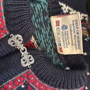 Elegant Nordic cardigan with intricate patterns. Features black, red, and white design. Perfect for cozy winter days.