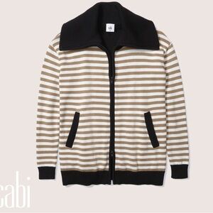 Cabi Mascot Zip Cardigan Brown & White Stripes with Black Trim & Collar