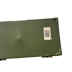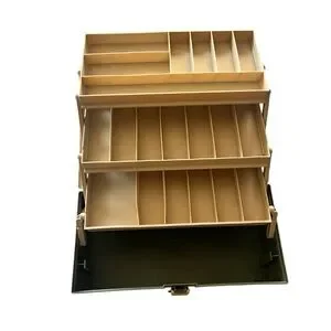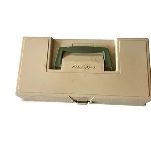 Plano tackle box in green and tan. Durable and spacious for organizing fishing gear.