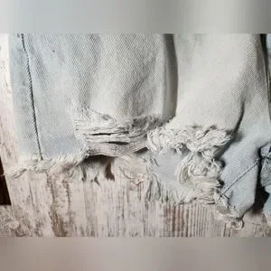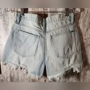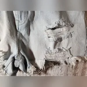 Trendy distressed jean shorts. Light blue color. Ideal for casual wear.
