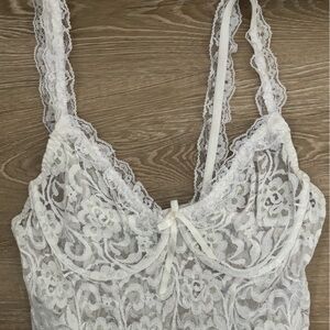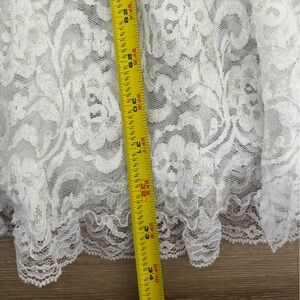 This top is made of a white lace fabric with an iridescent sheen! The bra area is boned and has a corseted seam line that flatters the body! The bottom is flared and has a ruffle lace trim! Size is MEDIUM but may fit a small as well!