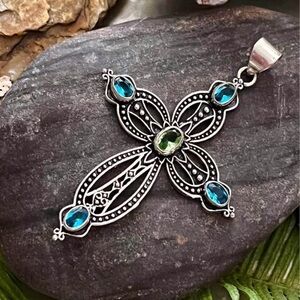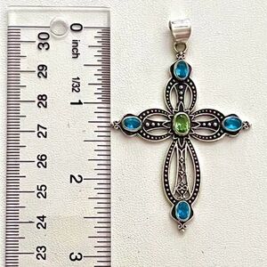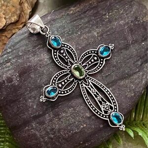 Handcrafted Blue Topaz & Peridot Sterling Silver Overlay 2.5” Cross Pendant. Stamped 925.