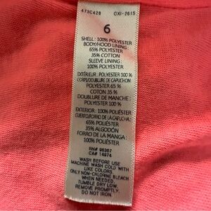 Material: shell: 100% polyester; body & hood lining: 65% polyester, 35% cotton; sleeves lining: 100% polyester.