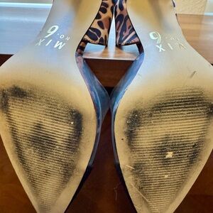 Step out in style with these chic Mix No. 6 heels. Featuring a striking black and leopard print design, these shoes are perfect for any occasion. Elevate your wardrobe with this bold and fashionable choice. Worn once! Left toe has a water spot on it. Very hard to see. Smoke free home. See images for details