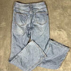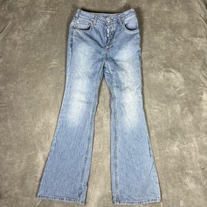 Description- light-medium wash. High waisted. Hidden button fly. Bit of a flare leg. Soft denim.