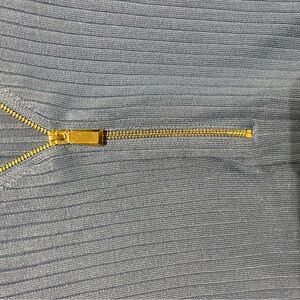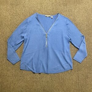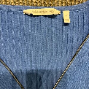 Soft Surroundings Elegant blue V-neck sweater. Features ribbed texture and gold 3/4 zipper detail; curved hem.