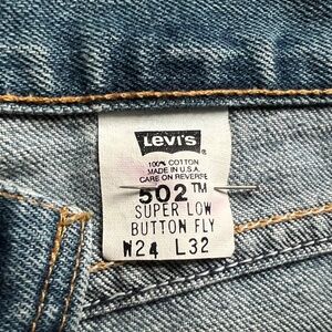 Vintage Levi’s 502 superlow button fly XS 24x32 deadstock NWOT,never worn, 100% cotton denium jeans in a medium fade, removed tags, stored away in my closet and almost forgotten about until recent. I believe the fit is a juniors.Nice density cotton the way they used to be made in the USA. The last photo is a reference # only.