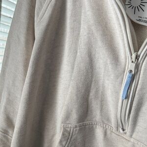 Soft cream hoodie with front pocket. Half-zip design. Ideal for layering.