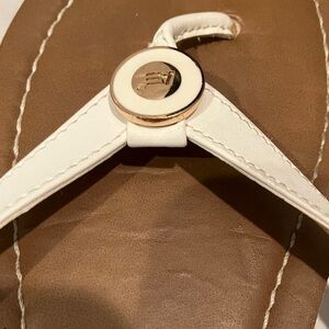 Chic sandals with a tan base and cream straps. Ideal for casual wear.