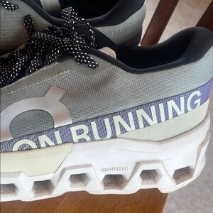 Stylish On Running sneakers. Gray upper with black accents. Comfortable and lightweight.