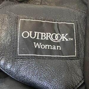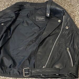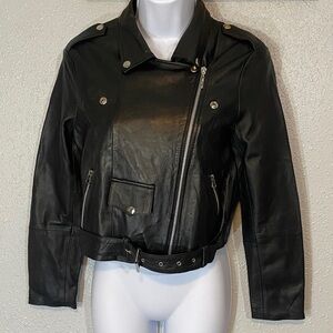 Elevate your style with this sleek black leather jacket. Perfect for any occasion, it offers a timeless look with a modern edge. No size tag but fits like XS/small. Pit to pit 17.5”. Shoulder to hem 18”. VGVC.