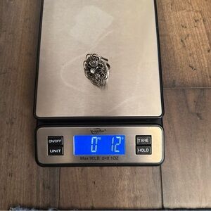 Ring does show where to the back and inside of the band. The ring is adjustable but is currently sized to an 8.5. Purchased from an estate sale. Vintage rain box is not included. Metals are not tested.