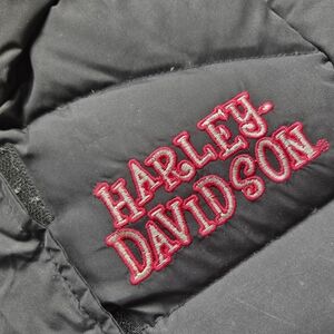 Stylish black puffer jacket for kids. Features a cozy fur-lined hood. Perfect for cold weather. Harley Davidson logo embroidered on front chest and across the back of jacket