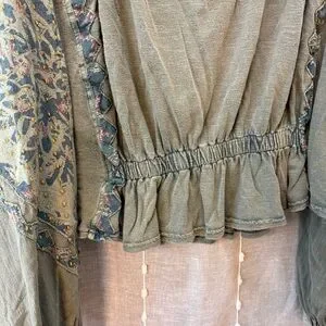 Chic olive blouse with floral embroidery. Features a relaxed fit and elastic waist. Ideal for casual wear.