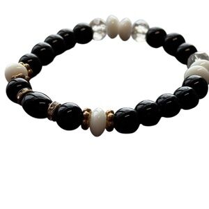 This chic bracelet showcases a striking blend of black and white beads, perfect for adding elegance to any ensemble. The design is both timeless and versatile.