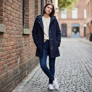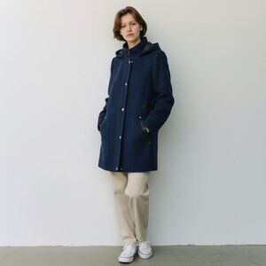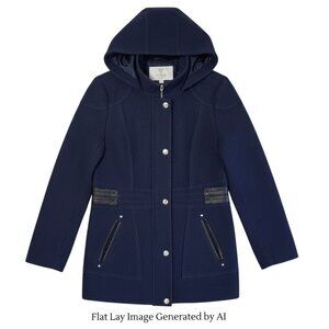 GUESS Los Angeles women’s hooded coat in a navy wool-blend fabric with a tailored, fitted silhouette. Features a snap-and-zip front closure, an attached hood, a fully lined interior, and a defined waist with decorative faux-leather belt tab accents. A versatile fall-to-winter coat designed for structured layering rather than an oversized fit.