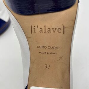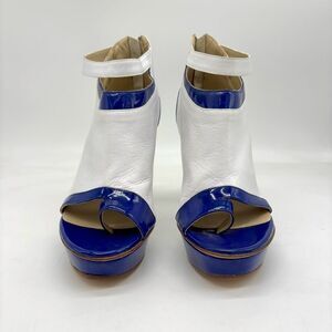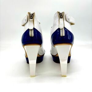 Blue/white smooth and patent leather combination with toe loop and snap ankle strap. 4-inch heel with 1-inch platform.