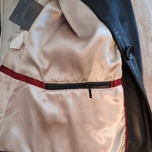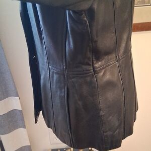 Elegant black leather jacket. Features a single-breadted style with two button closure. Fully lined. supple soft leather. very wearable. Two exterior side slit pockets and two interior zipper pockets. Perfect for any occasion. measurements in photos