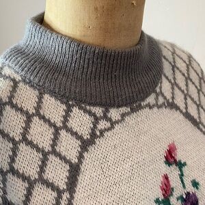 A beautifully whimsical vintage knit featuring a soft grey base with a charming hand-drawn style floral motif in pinks, purples, and greens. Cozy, nostalgic, and full of personality.