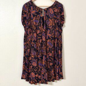 Free People "Hello Lover" black tunic dress with orange & purple floral print, ruched puff mutton sleeves, loose oversized fit, high-low hem, and keyhole back with button closure. Fabric has some stretch to it.