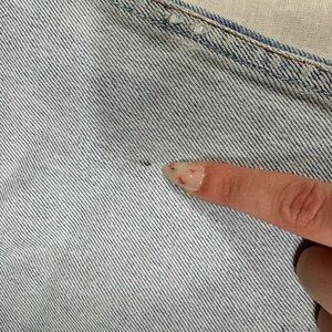 Timeless VTG Levis Mid Rise straight leg jeans in light wash, button fly, distressed, slight staining which is shown in pictures. 100% cotton and USA Made.